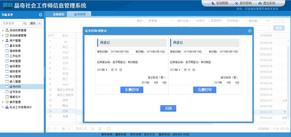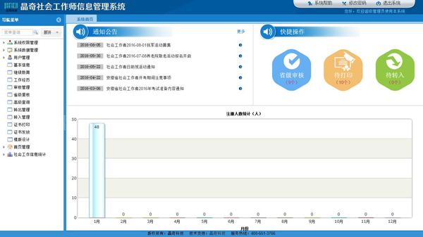 系統主要實現社(she)(she)會工作者信息(xi)(xi)在線登記、繼續教育、轉(zhuan)入(ru)轉(zhuan)出(chu)、審批(pi)、證(zheng)書(shu)打印、綜合查詢(xun)和統計分(fen)析(xi)等網絡(luo)信息(xi)(xi)化處理。實現全(quan)省社(she)(she)會工作人(ren)才資源的有效共享、實時管理與服(fu)務,建立社(she)(she)會工作師人(ren)員信息(xi)(xi)數據(ju)庫,滿足各(ge)級民(min)政主管部門(men)對社(she)(she)工師的管理和服(fu)務需(xu)要,提供對各(ge)類專(zhuan)業人(ren)才數據(ju)的查詢(xun)、分(fen)析(xi)、統計等功能。