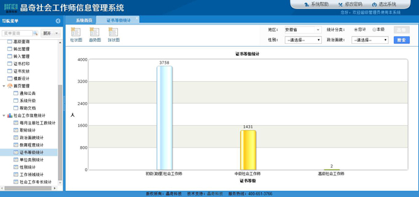 支持(chi)按職稱、政治面貌、教育程度(du)、證書等(deng)(deng)級、單位類別(bie)、性別(bie)、工(gong)作領域等(deng)(deng)多(duo)維(wei)度(du)來統計社會(hui)工(gong)作者信息。