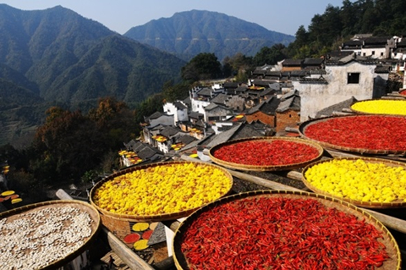 旅程的最后一天,我們來到了婺源。婺源的秋是攝影師的天堂,淡雅的水墨建筑里透著幾分秋的芳香,婺源的美被無數攝影愛好者記錄為中國最唯美的古村落。我和我的小伙伴們游覽到此地時,偶遇另一番景象——“曬秋”。這里的“曬秋”聞名遐邇,每家每戶房前屋后長長木架托起圓圓的曬匾,火紅紅的辣椒、金燦燦的稻谷,秋高氣爽,曬秋景象美的令人感嘆!