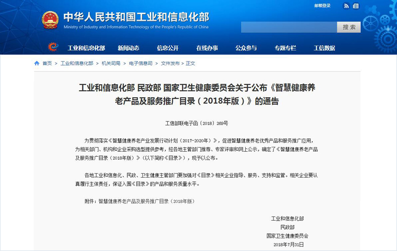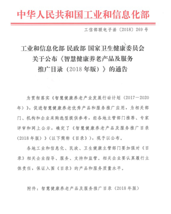文件二:工業和信息化部 民政部 國家衛生健康委員會關于公布《智慧健康養老產品及服務推廣目錄(2018年版)》的通告