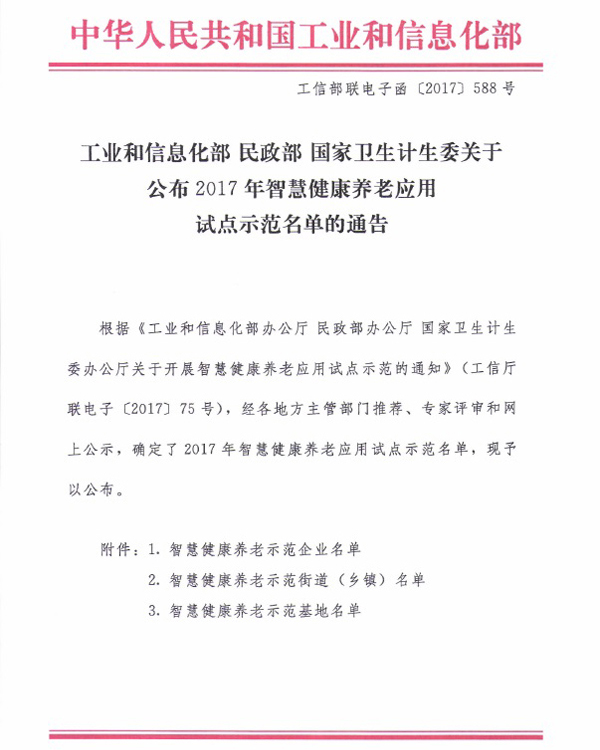 文件一:工業和信息化部 民政部 國家衛生計生委關于公布2017年智慧健康養老應用試點示范名單的通告