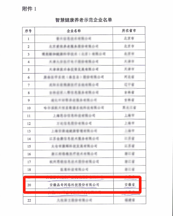 2017年8月,晶(jing)奇(qi)網(wang)絡(luo)被國(guo)家工(gong)信部(bu)(bu)、民(min)政部(bu)(bu)、衛計委(wei)三(san)部(bu)(bu)委(wei)聯合評(ping)選為(wei)(wei)“國(guo)家級智(zhi)慧健康養(yang)(yang)(yang)老(lao)示(shi)范(fan)企業”,并于12月在北京人(ren)民(min)大會堂正式(shi)(shi)授(shou)牌。此次,入選《智(zhi)慧健康養(yang)(yang)(yang)老(lao)產(chan)品(pin)及(ji)服(fu)(fu)務(wu)(wu)推廣目(mu)錄》,是對晶(jing)奇(qi)網(wang)絡(luo)在智(zhi)慧健康養(yang)(yang)(yang)老(lao)服(fu)(fu)務(wu)(wu)領(ling)域(yu)的再次鼓勵和認可。晶(jing)奇(qi)網(wang)絡(luo)將繼續(xu)以老(lao)齡人(ren)口、社會組織、居民(min)健康檔案為(wei)(wei)主線,以老(lao)年人(ren)需求為(wei)(wei)核心(xin),完善養(yang)(yang)(yang)老(lao)服(fu)(fu)務(wu)(wu)體(ti)系、創新養(yang)(yang)(yang)老(lao)服(fu)(fu)務(wu)(wu)模式(shi)(shi)、提升養(yang)(yang)(yang)老(lao)服(fu)(fu)務(wu)(wu)水平(ping)為(wei)(wei)目(mu)標,完善信息化(hua),智(zhi)能化(hua)產(chan)品(pin),繼續(xu)推進“互聯網(wang)+醫療健康”服(fu)(fu)務(wu)(wu)模式(shi)(shi),為(wei)(wei)中(zhong)國(guo)智(zhi)慧健康養(yang)(yang)(yang)老(lao)服(fu)(fu)務(wu)(wu)產(chan)業持續(xu)發力!