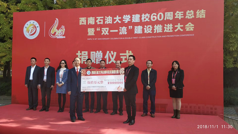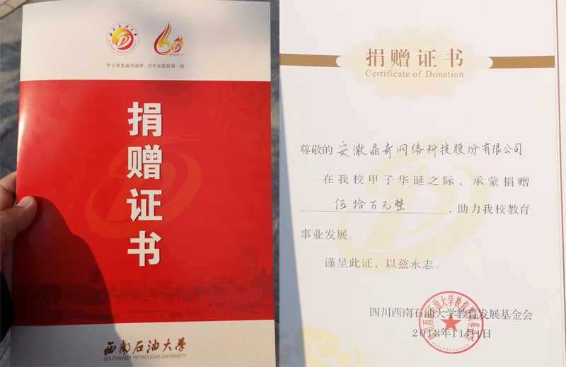 11月1日,安徽晶奇網絡科技股份有限公司向西南石油大學捐贈50萬元,用于支持西南石油大學相關專業的人才培養,激勵學生刻苦學習、全面發展,捐贈儀式在西南石油大學的石泉廣場舉行。