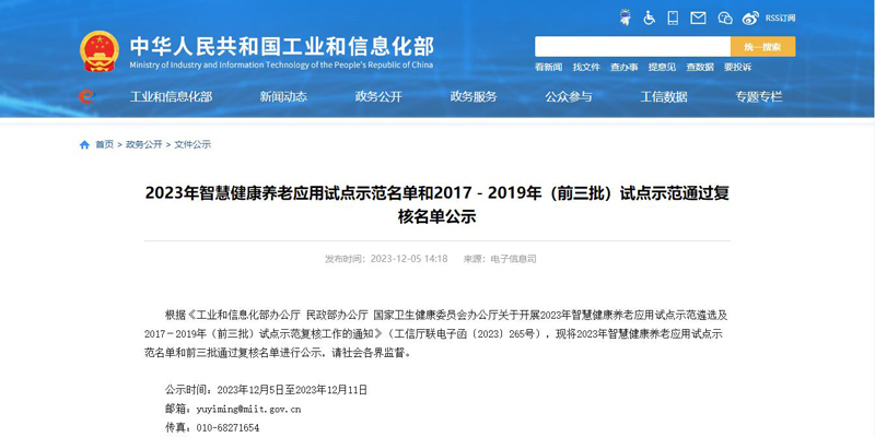 12月5日,工信部公布2023年(nian)智慧健康養老應(ying)用試(shi)點示范名單及(ji)2017-2019年(nian)(前三批)通過復核名單進行公示。