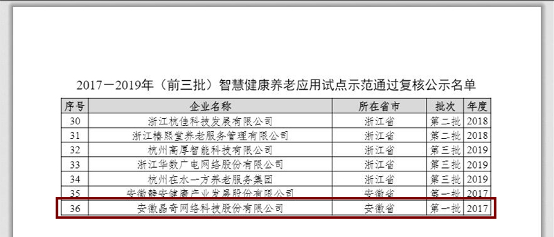2017年公司成為首批智慧健康養老應用試點示范企業,現復核再次入選2023年智慧健康養老應用試點示范公示名單,晶奇網絡被評(ping)選為2023年智慧健(jian)康養(yang)老示范企業。