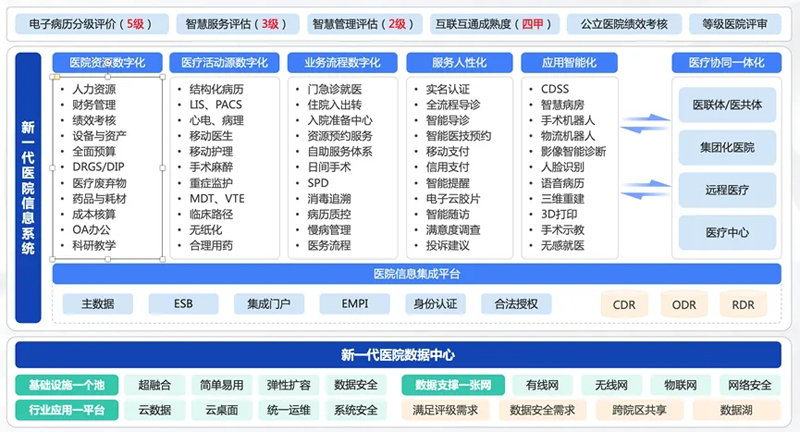 新一代的(de)智(zhi)慧醫院信息系(xi)統(tong)架(jia)構(gou)(gou)是以醫院信息集成平臺為基石,構(gou)(gou)建數(shu)據(ju)標準和(he)業(ye)務交互(hu)的(de)底(di)層服務框架(jia),上層業(ye)務系(xi)統(tong)實現全(quan)部醫療資源的(de)數(shu)字(zi)化、全(quan)部醫療活動的(de)數(shu)字(zi)化、全(quan)部業(ye)務流(liu)程的(de)數(shu)字(zi)化,結合(he)人(ren)工智(zhi)能、大數(shu)據(ju)、物聯網等其(qi)他先進技術的(de)不(bu)斷(duan)(duan)發(fa)展(zhan)和(he)應用,持續推(tui)動和(he)促進醫院的(de)數(shu)字(zi)化轉型,不(bu)斷(duan)(duan)推(tui)進數(shu)字(zi)化改革。